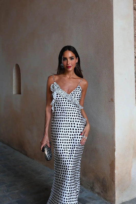 Fantasy Puantiyeli Desenli Güpür Fırfırlı Askılı Maxi Elbise