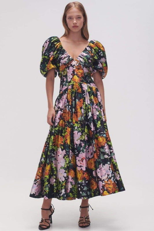 Megan Baskılı V Yaka Puf Kollu Midi Elbise